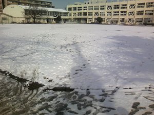 昼前に校庭に行って様子を見たのですが、最初は一面真っ白でしたが、時間が経つにつれて校舎側の方から次第に解けてきました。